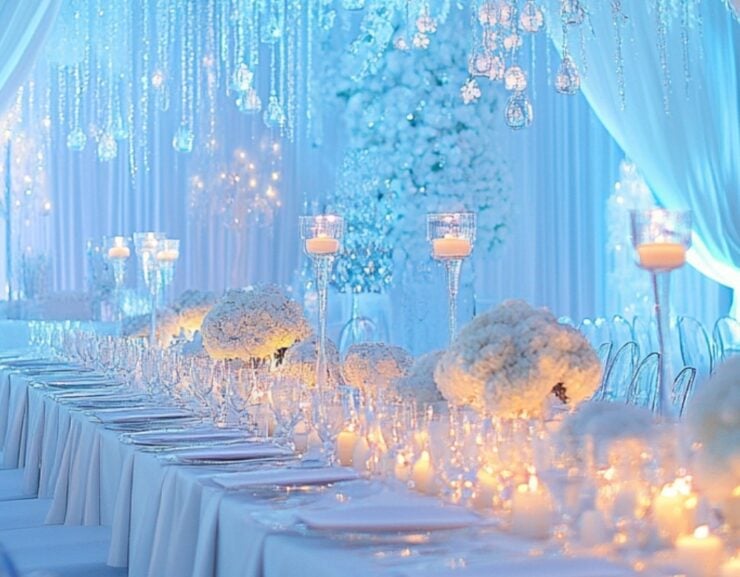 Provide your guests with the entire wonderland experience by incorporating a winter color scheme of snowy hues. This monochrome winter palette is naturally pleasing to the eye and allows you to flex your creativity when picking out different kinds of textures for your venue decorations.
